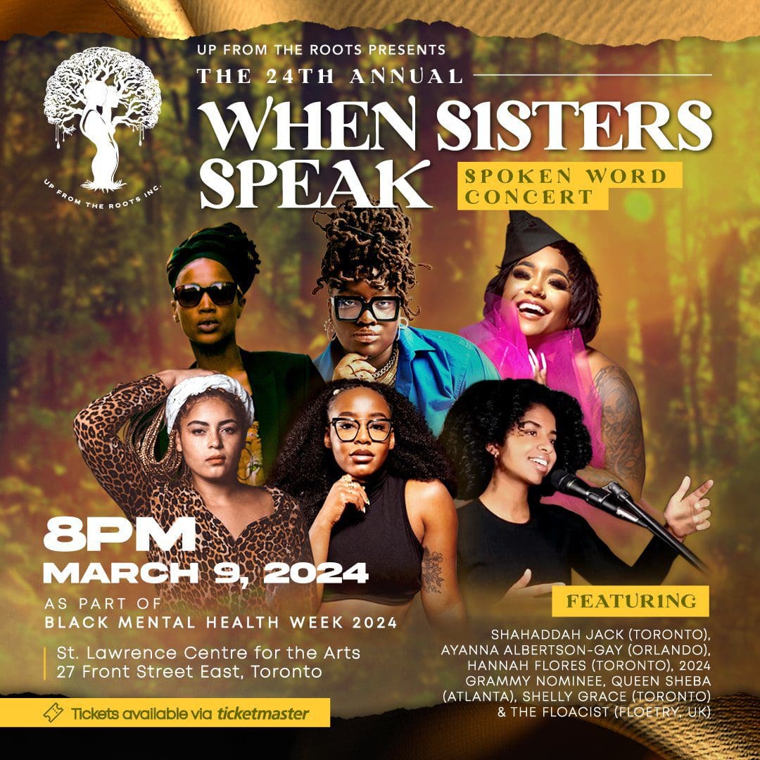 When Sisters Speak will feature performances from 2024 Grammy nominee, Queen Sheba (Atlanta), 5-time Grammy nominee and one half of the group Floetry, The Floacist (UK), Ayanna Albertson-Gay (Orlando), Canadian National Poetry Slam Champion, Shelly Grace (Toronto), Hannah Flores (Toronto), and Shahaddah Jack (Toronto).