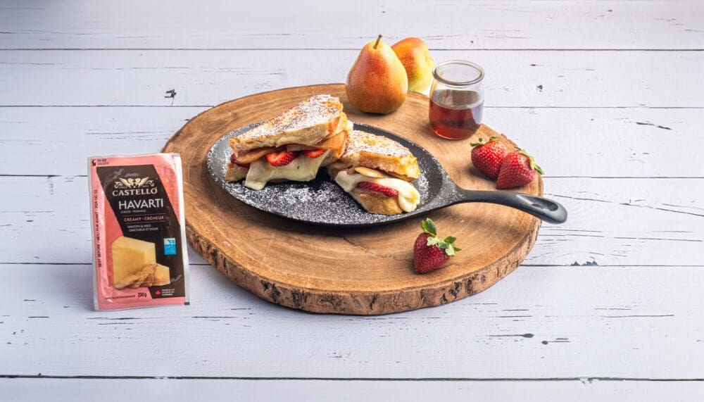 - Build a sandwich with the cooked pears and a generous amount of Castello Creamy Havarti. Option to add in sliced strawberries.