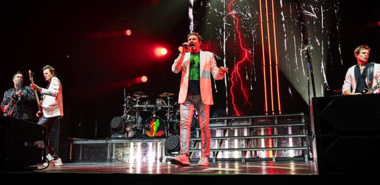 Their newest song, Danse Macabre, the title track from their forthcoming Halloween-themed album of covers and reimaginings brought a dark thumping bass and beat as well giving energetic backup singers Anna Ross and Rachael O’Connor a chance to absolutely slay with their harmonies. It also gave Simon a chance to spit some bars. Planet Earth got all the creaking Gen X knees up and bending and served as the band intro section of the show. Nick Rhodes cracked what looked like a grin when the girls cried out after his intro. Love it or hate it, and I’ll say that upon first listen, I was firmly in the latter, the band performed their cover of Grandmaster Melle Mel’s White Lines next. I will admit to being a changed man in this opinion. It was the highest energy performance of the night and if another in the crowd needed it, I think I was joined by a few more converts. Two more classics, The Reflex and Girls on Film (segueing in and out of Calvin Harris’ Acceptable in the 80s) followed and I couldn’t help but think of the video for the former, shot at that show I attended in 1984. If I recall correctly, they played the song twice that night for the shoot. I then remembered after the video was released some schoolmate told me that their sister got soaked when the water poured out of the video screen at that show. Oh, the fables from a simpler, dumber time! As well, every male Durannie in Toronto or their dumb brother claimed to be this guy. Duran Duran left the stage for a minute then returned for a pair of encore songs. Telling the crowd it was time to sing, Le Bon instructed that he’d handle the verses and the audience’s responsibility was the choruses. No one needed to be encouraged to put some emotion into singing the ageless ballad, Save A Prayer. Though the crowd was ringing, it would be impossible to expect a volume similar to that night in Toronto in 1984. However, the chorus of voices that sang loudest on this night like that one was clearly and loudly feminine. There was only one song missing to complete the set and that was the title track off their second album, Rio. Although not explicitly pressured to do so, it became another singalong and put that final smile on all assembled. Taking plenty of time to wave their goodbyes, Duran Duran finally left the stage. But the nostalgic smiles, on the band and crowd remained.