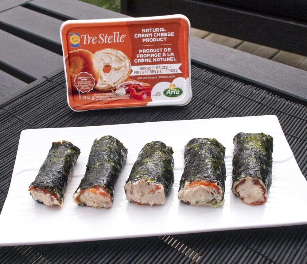 Spread Tre Stelle Herbs & Spices cream cheese onto a piece of seaweed and layer with shaved cucumber slices and smoked salmon. Roll into “sushi” rolls.