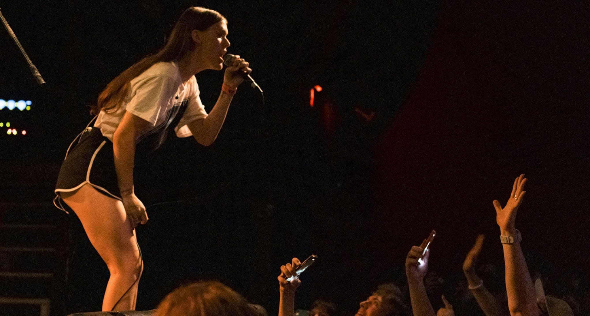 Wearing jean shorts & a t-shirt featuring Susan Sarandon, Cain made her 666ix debut, opening the set singing “Dust Bowl” whilst half hanging out of the 2nd floor side-stage green room window, one leg dangling down, teasing the crowd as she took her time making her way down. As soon as she joined her band (featuring guitarist and opener Colyer) the crowd cheered even harder, welcoming her in warmly.