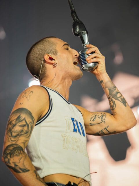 Now, it was time for the acoustic moment of the night. The stage went completely dark and empty for a few seconds. Then, at the back of the arena, a small stage lit with Damiano and Thomas holding an acoustic guitar. The moment the fans on the floor saw them, they ran to get closer. They started the segment with the tune TIMEZONE, and all across the Arena, phones lit up and moved softly with the song’s beat. Afterward, Damiano David recalled back to 2016 when the four musicians used to perform covers on the streets of Rome, like Back to Black by Amy Winehouse, and continued to sing the Jazz classic next to Thomas on the guitar.