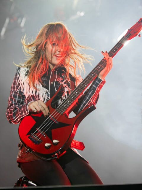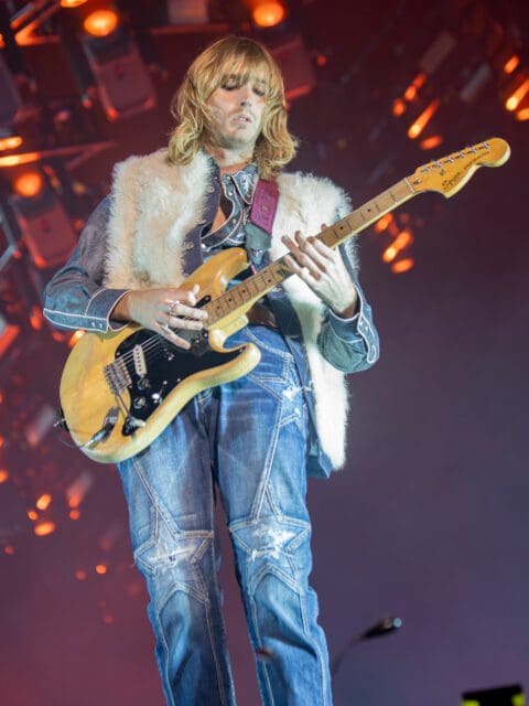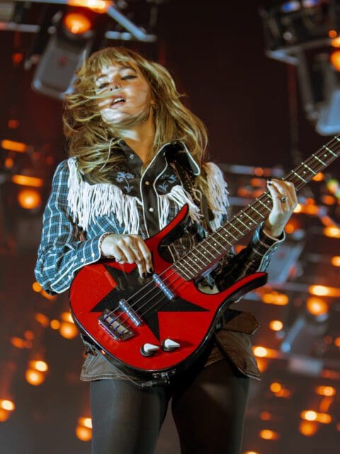 The band opened their setlist with DON’T WANNA SLEEP from the album RUSH! They began singing while the red velvet curtain still showed their defined shadows; they got to the chorus, and then the curtain was lifted, revealing the quartered matching bold blue and white rodeo outfits, Vocalist Damiano singing with a vintage microphone hanging from the ceiling, while bass player Victoria and guitar player Thomas unfolded an electrifying energy across the stage. Next came the song GOSSIP, also from the album RUSH!, which features a guitar solo by Tom Morello, but in his absence, Thomas Raggi stole the stage, performing a breathtaking guitar solo on his own. Leading into the next song, Zitti E Buoni a song that despite being sung entirely in Italian did not stop the audience from singing along.