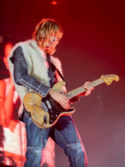It was time for the second highlight of the night with the song KOOL KIDS, where the Italian band invited fans from the floor to join them on stage to dance, jump, and sing; the song ended with Thomas’s thrilling solo playing with the guitar and the pedalboard, and several of the fans on stage knelt to praise the talented guitarist. The solo ending led to a solitary guitar part where Thomas stood in the middle of the stage under a spotlight.