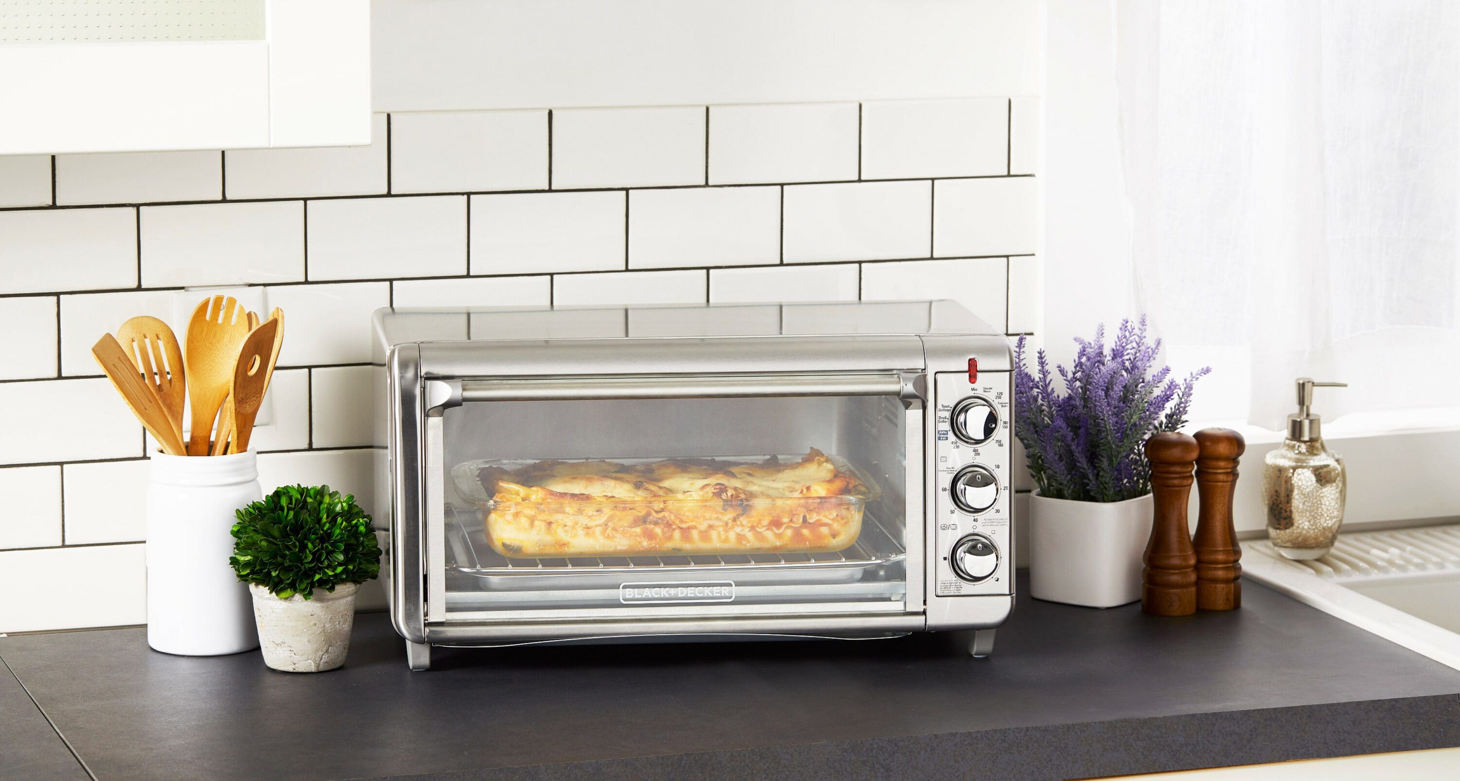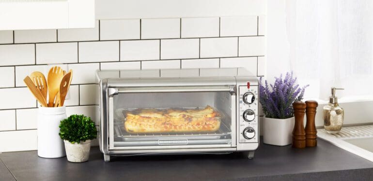 The brand’s Air Fry Technology uses high-intensity hot air to “fry” foods with little to no oil. Imagine a toaster oven with convection functionality – heat, a compact space and hot air come together to create deep-fried tasty goodness, without the greasy, heavy feel. From all manner of fried potato to entire lasagnas or pizzas, there’s no meal this machine can’t tackle. Three control knobs make it easy to set the toast timer and 60-minute timer, and choose from five cooking functions: bake, broil, toast, keep warm, and air fry. This toaster oven also includes an air fry basket, bake/broil pan and rack, and an external crumb tray that slides in and out to make cleanup a breeze.