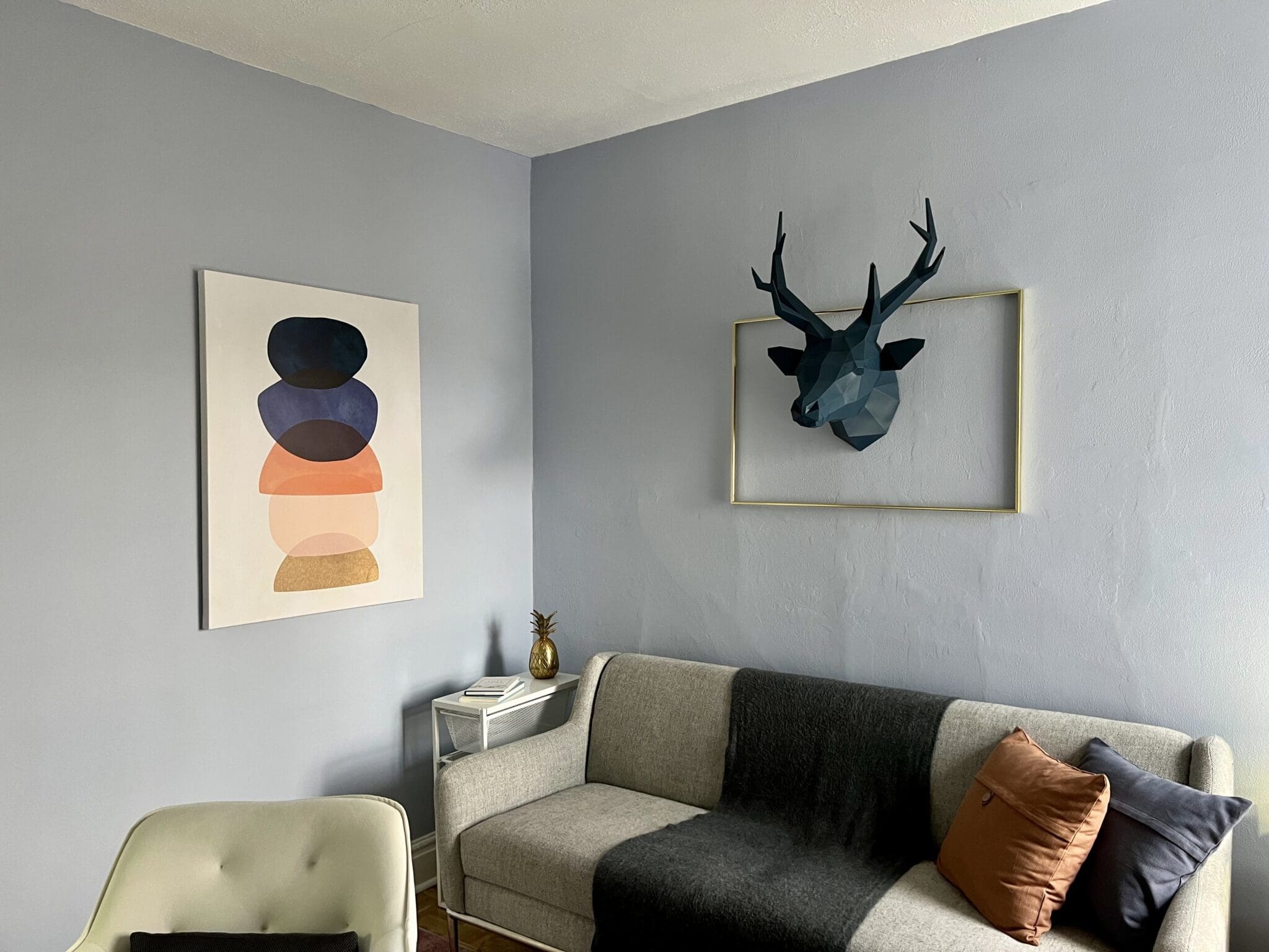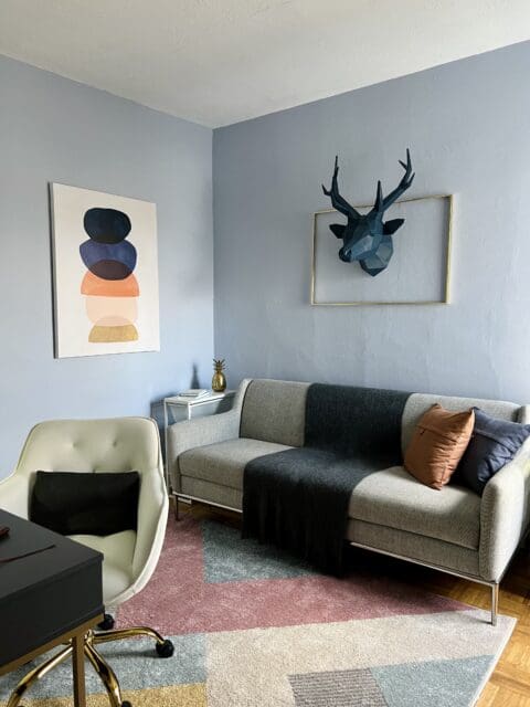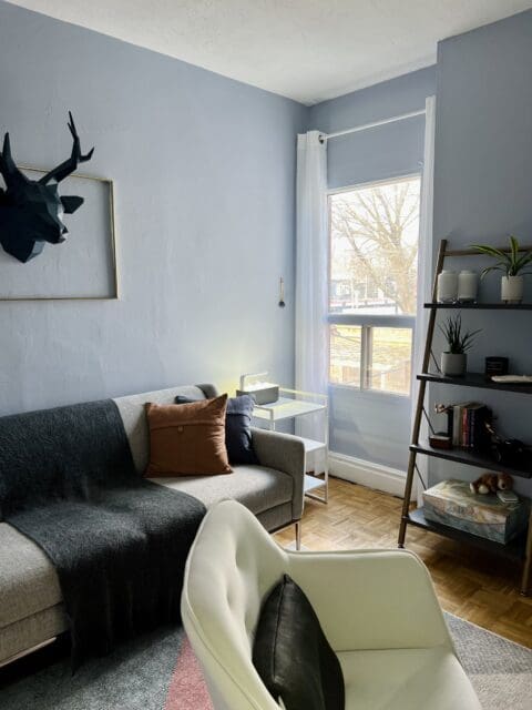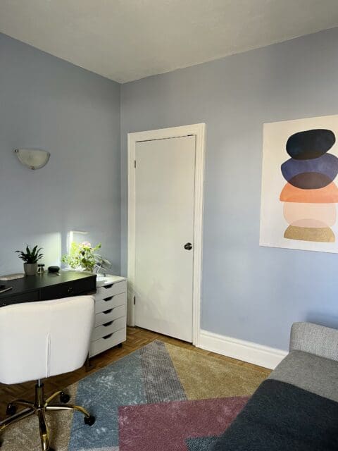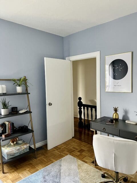 For my office, I wanted to create a calming and bright space. So I decided to bring in some colour, some texture and painted with Morning Meditation and super chill blue. I figured that way would give me the best potential to be as productive as possible.