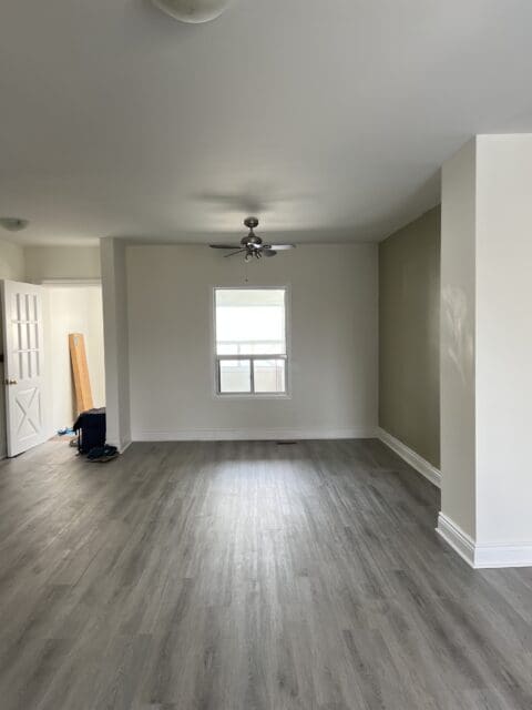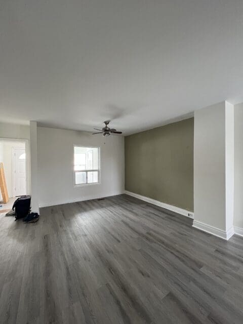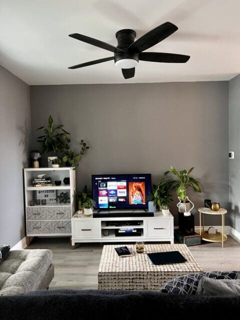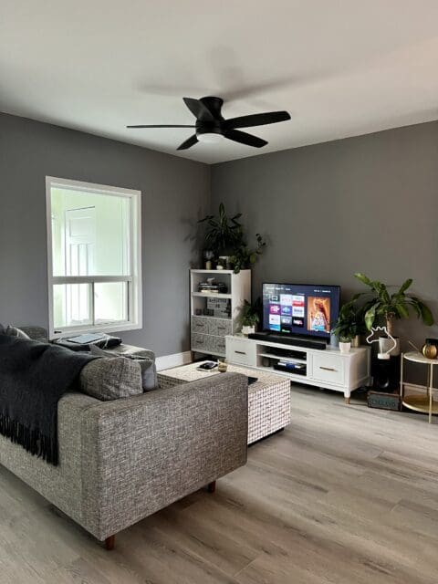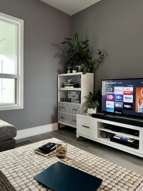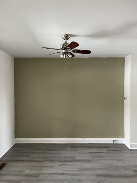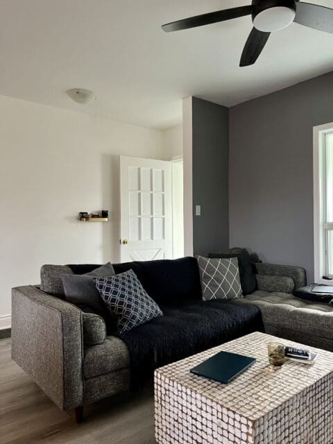As you can see, the living room needed an update. It had one badly painted wall in an unflattering colour, and the white walls looked somewhat yellowed. So we decided to go with a medium but deep grey that would make the space look crisp, clean and as new or close as possible.