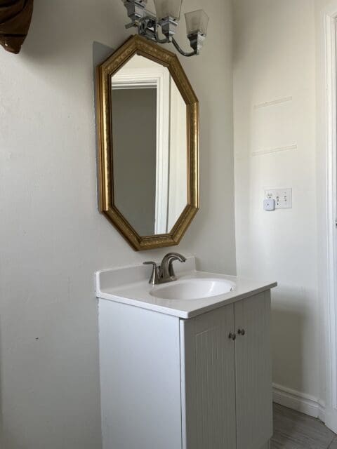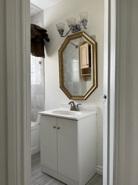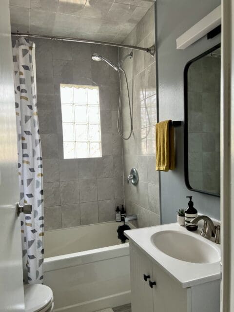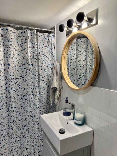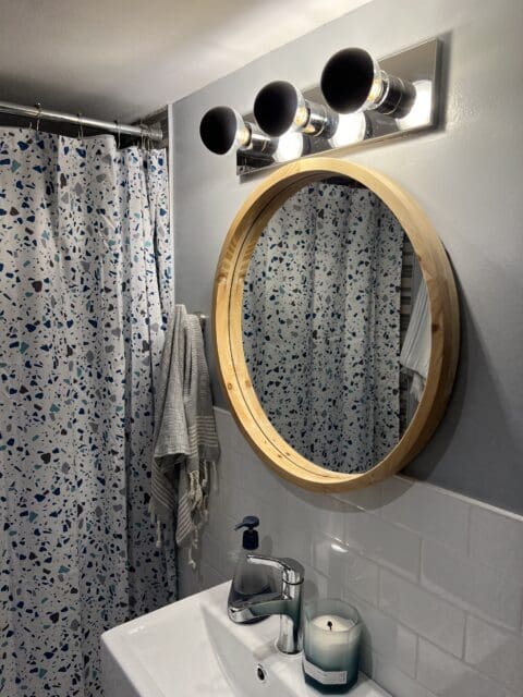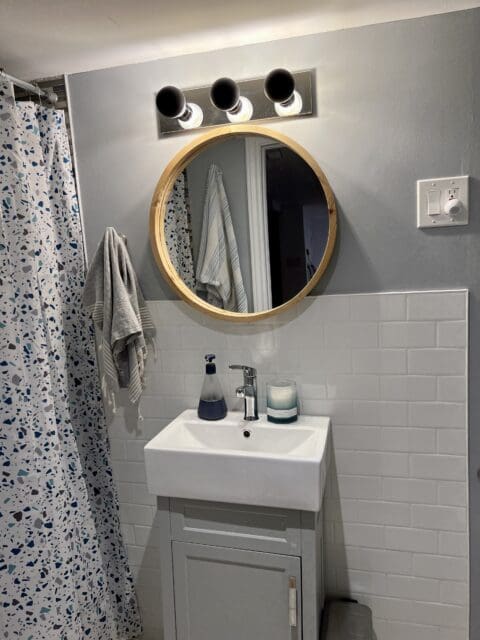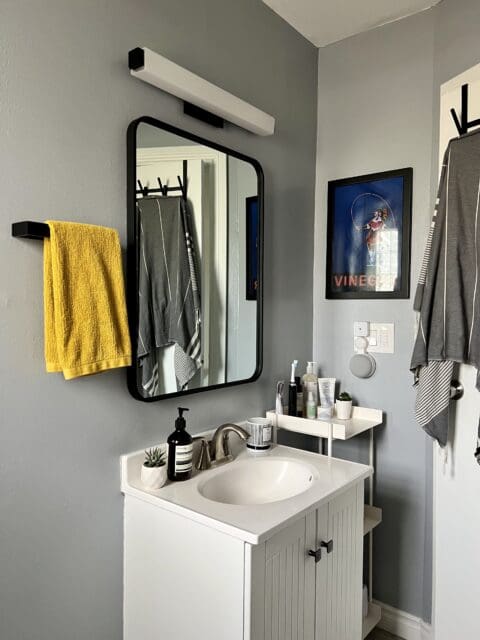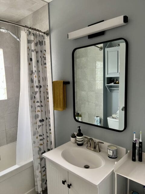 A new light, mirror, shelf, bathmat, curtain, and of course, the paint job and the bathroom went from trainwreck to terrific, and I have to admit, I now love this space.