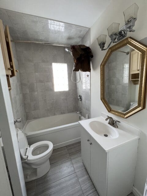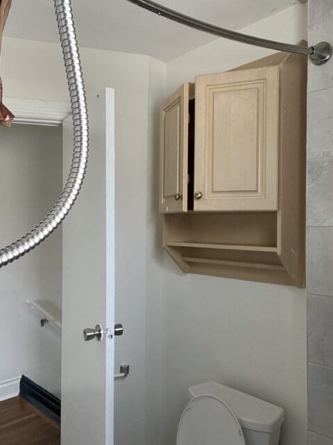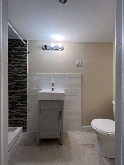 The upstairs bathroom, to the eye, was a complete mess. The fixture, mirror, and shower curtain all had to go, but we also wanted to paint to give it a fresh update and to bring some subtle colour in, so we went with a light grey to spruce up the space.