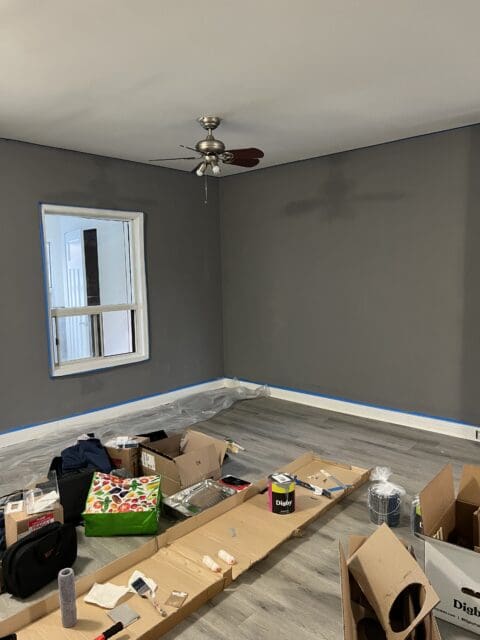 - Wash the walls and clean the baseboards – If I’ve learned anything about painting over the years, it’s to wipe down the walls before you paint. Dirt, dust, scuffs, glue, spackles, even in new places, it’s necessary to wipe down the walls so that the paint properly adheres to the wall, primer or not. Take a cloth and a bucket of lukewarm water, and wipe off any residue, dusk, cobwebs, etc. The paint job will adhere while looking it’s very best.