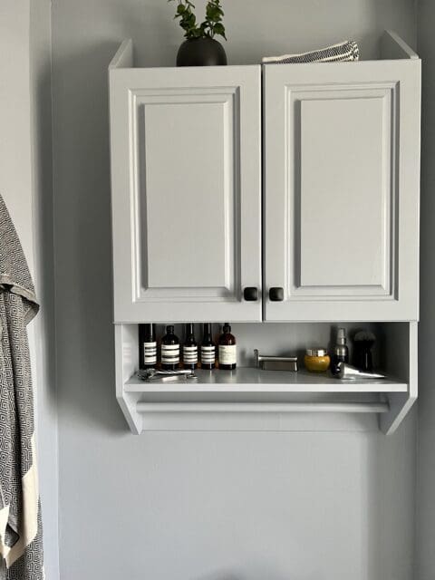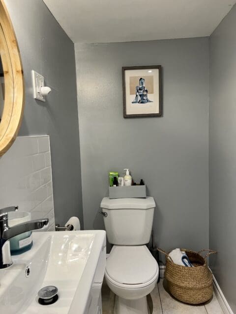 Since we didn’t like the colour in the downstairs bathroom, and we liked Murder Mystery, the paint we used in the upstairs bathroom, so we used that same colour to refresh the downstairs bathroom.