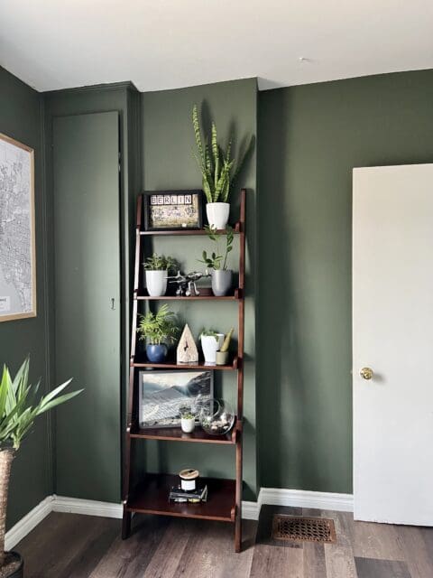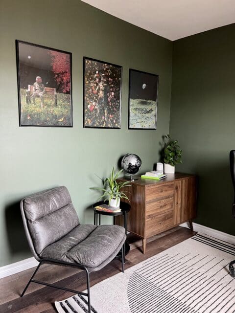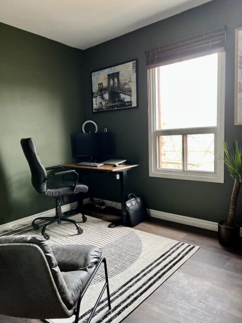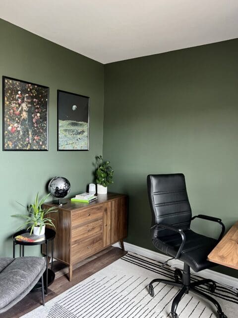 The first office (my partner and I both work from home) wasn’t too bad, but it needed some personality and a good cleaning. We wanted it to feel like an old-world study with a modern edge, so we decided we would go with an earthy green and bring in tones and textures that are more natural, along with black metal to balance that out.