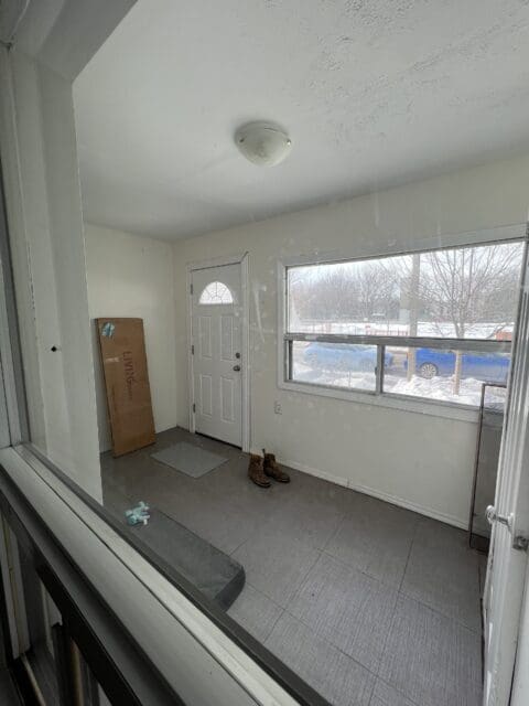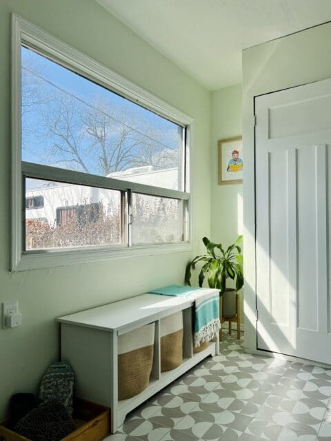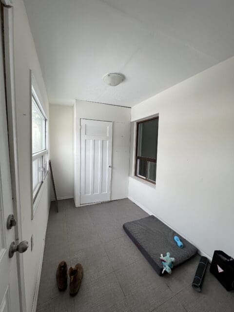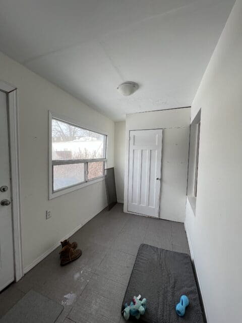 As you can see, the mudroom needs more than a bit of love, so that’s precisely what it’s going to get. Walls fixed (as best we can), the metal around the window, baseboards and walls painted, new floor, and some furniture and decor.