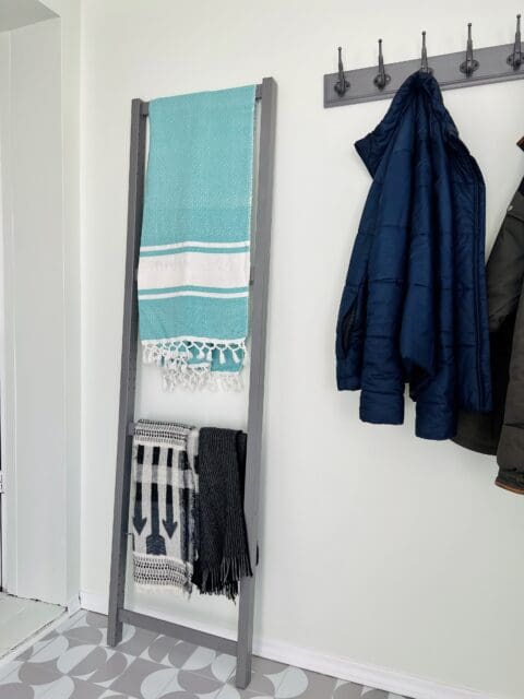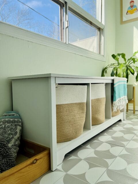 - Build or repurpose furniture – We had some pieces we wanted to put in the room, one of which needed a makeover. We also needed more storage, so we bought the cubby bench from Home Depot and then used white paint and a clear coat to refurbish the toy box. We also bought grey spray paint and recovered the scarf rack and coat hanger backing. We left the table as-is and, of course, put together the new store bench we purchased. (Spray paints picked up at Home Depot, along with the South Shore Vito 3-Cubby Storage Bench in Pure White)