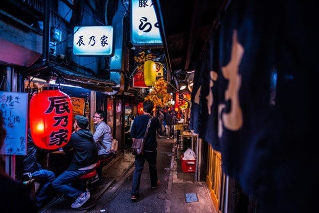 Neighbourhoods for bars and eating stalls to explore in the Shinjuku area: Omoide Yokocho and Golden Gai. Omoide Yokocho, dating back to just after World War II, was originally established as a black market with lots of food stalls, and bars, where people would head for cheap drinks and eats – charcoal-grilled meat skewers, especially chicken (Yakitori) and pork or beef. Today, the streets are still lined with small food stalls, where each vendor is serving something different – try the chef’s choice while sipping on a local beer. The names of restaurant stalls can be hard to distinguish but some to try include: Sasamoto and Tachan. You can go from food stall to food stall but be prepared to use cash. There is a 90 minute seating limit, and there will be a queue of people waiting, so you can move on to another stall or move on to drinks!