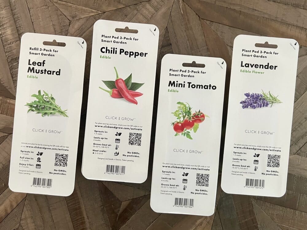 The Click & Grow plant pods come in a variety of options, including herbs (basil, thyme, cilantro), leafy greens (lettuce, kale), flowers (petunias, busy Lizzie), and even fruits (strawberries, mini tomatoes). The pre-seeded pods make it easy to start growing immediately.