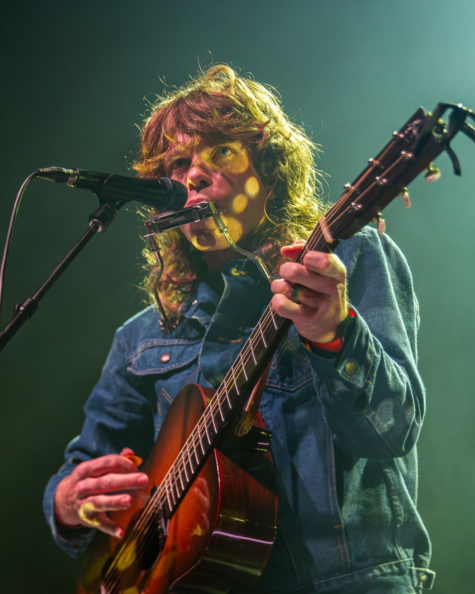 Jesse Welles playing a Rockbridge guitar and a harmonica while being lit by spotlights on stage at The Danforth Music Hall in Toronto