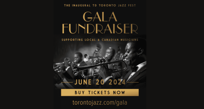 The inaugural Toronto Jazz Gala, on June 20th, aims to give 100% of net proceeds to supporting local and Canadian artists playing Jazz Fest 2024 this June. Their goal is to provide a fair paycheque and large audiences to more than 750 musicians across 125+ performances.