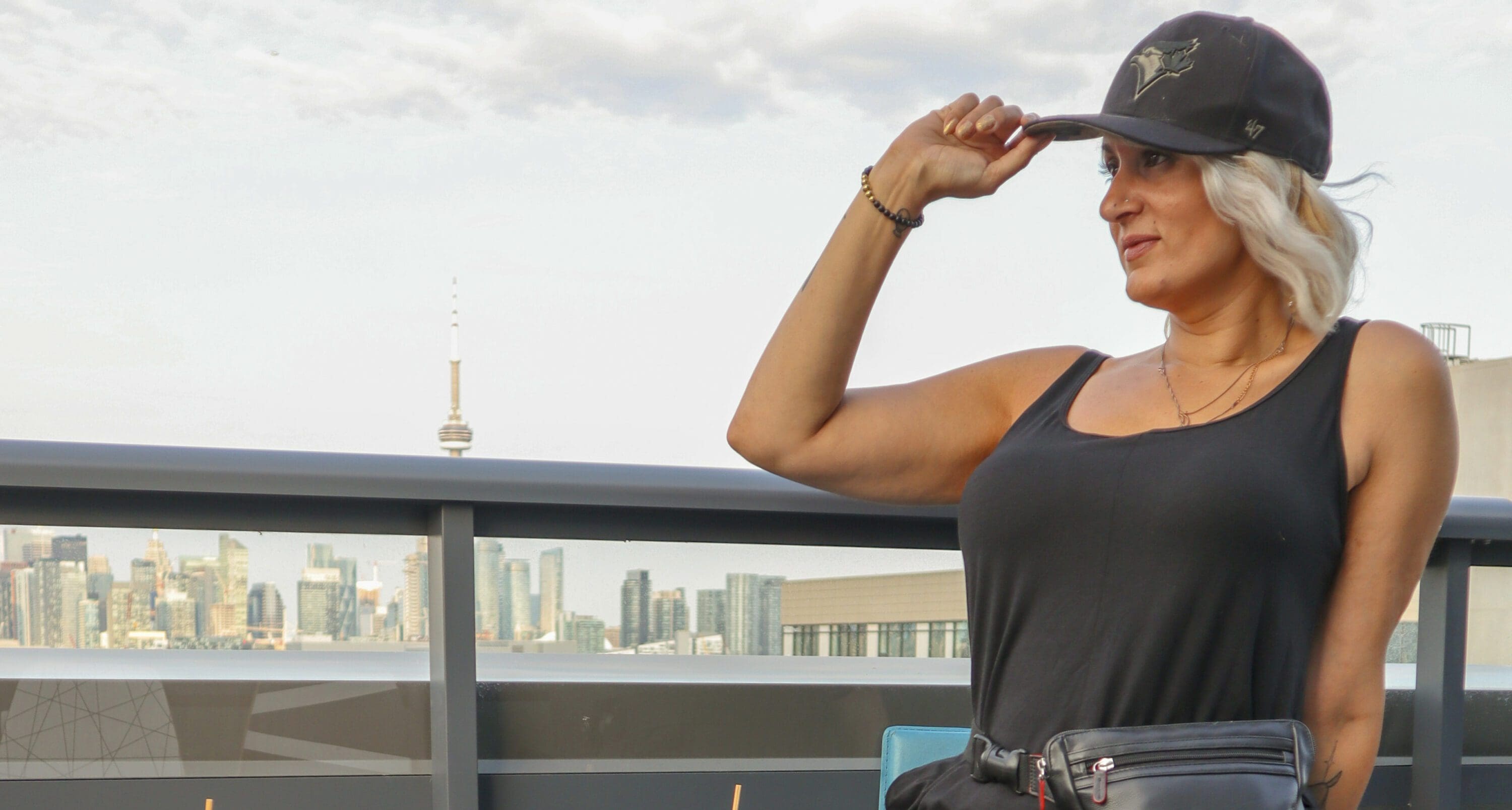 The super comfortable Tuesday romper is perfect for lounging around at home, but if you’re feeling yourself, feel free to take her to an afternoon baseball game.  You can drink all the beer and enjoy all the snacks you want thanks to the soft and stretchy patented S&T fabric.  Secret comfort, and style on blast.  Pair with your favourite sporty sandals or sneakers and your team’s baseball cap and you’re ready to catch a fly ball in the 7th inning.  I love wearing mine with my ili New York belt bag, that helps to cinch the romper at the waist for a more polished look, while keeping my credit cards, cell phone and hand sanitizer handy.