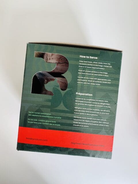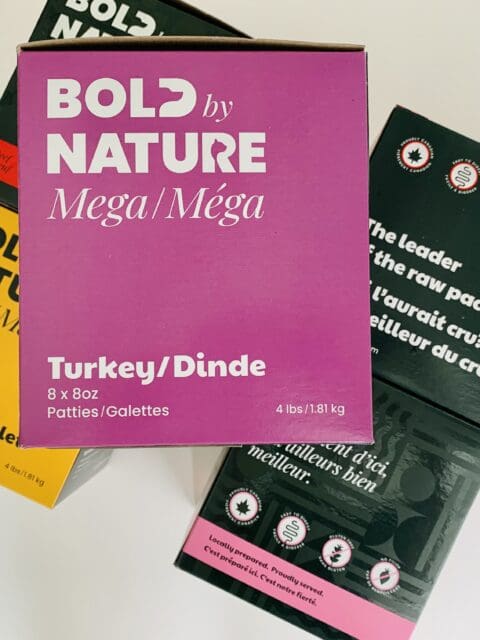Bold by Nature offers their raw Select Dog Line; their original recipe provides blends made with their signature green beef tripe, ground meat, triple ground bone, and organ meats. Their Mega Dog line comprises of ground meat, ground bone and organ meats, a fresh vegetable medley, and kelp.