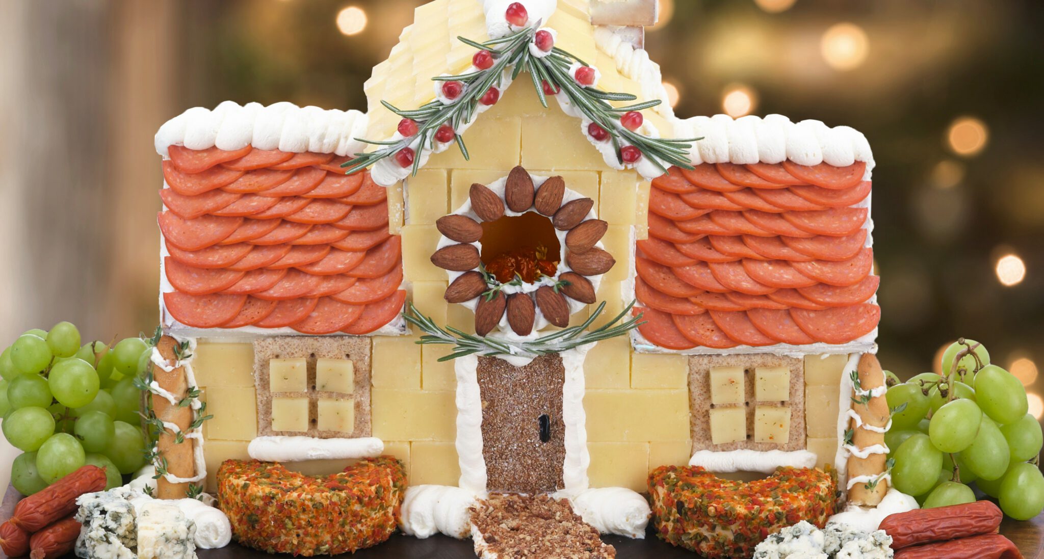 Pipe a path for the front door and top with ground candied pecans, then have fun filling the space on the board with all your favourite charcuterie ingredients!