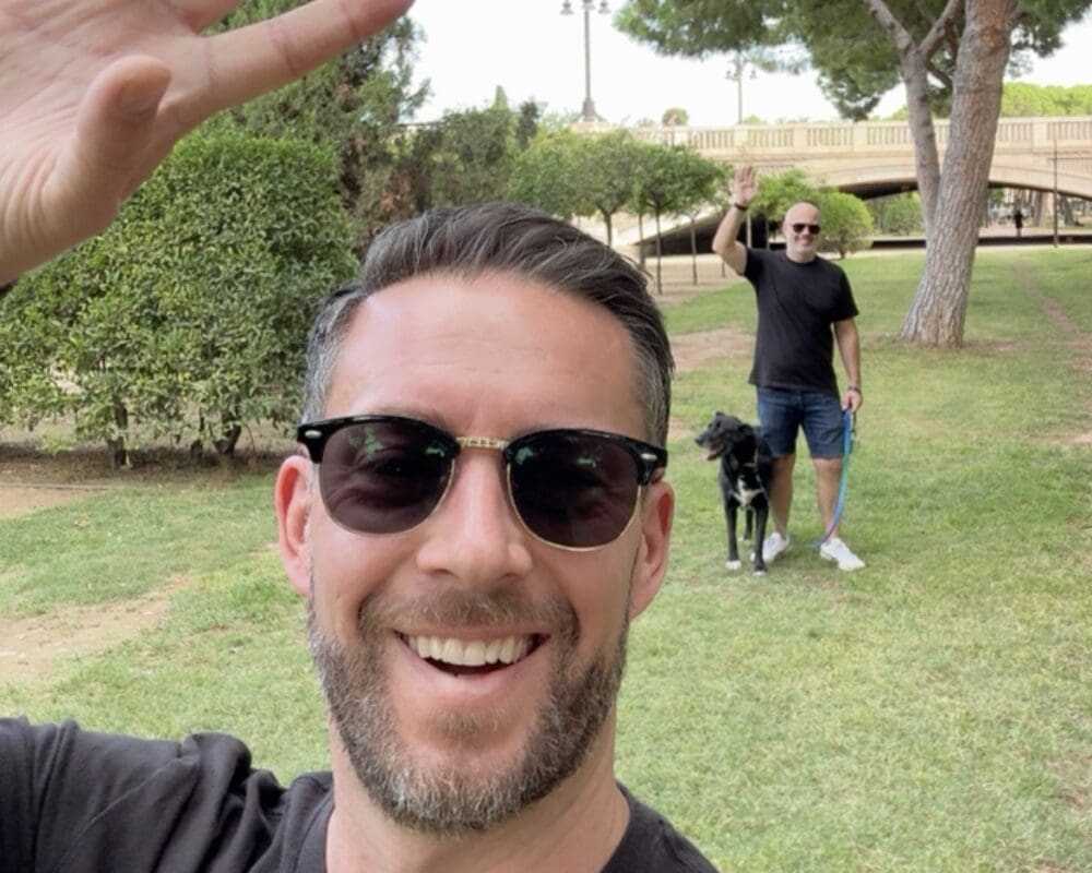 Mark Munroe, his partner beau and their dog manny out for a walk