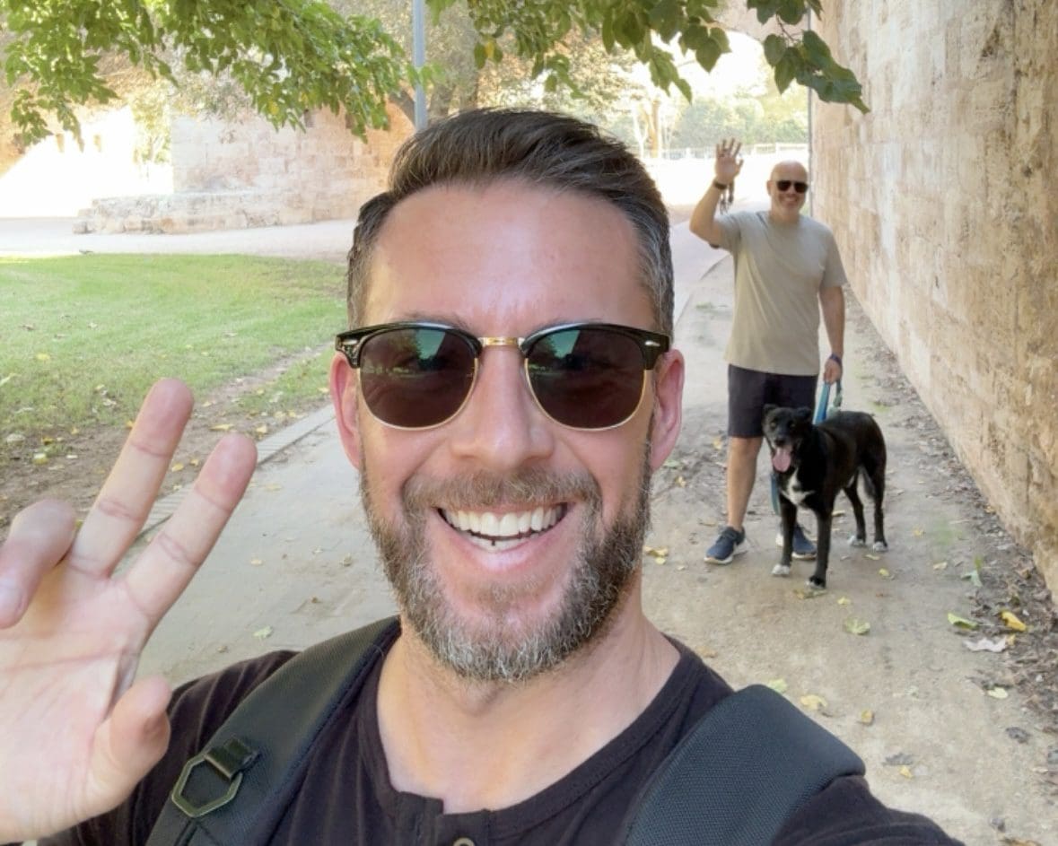 Mark Munroe, his partner beau and their dog manny out for a walk