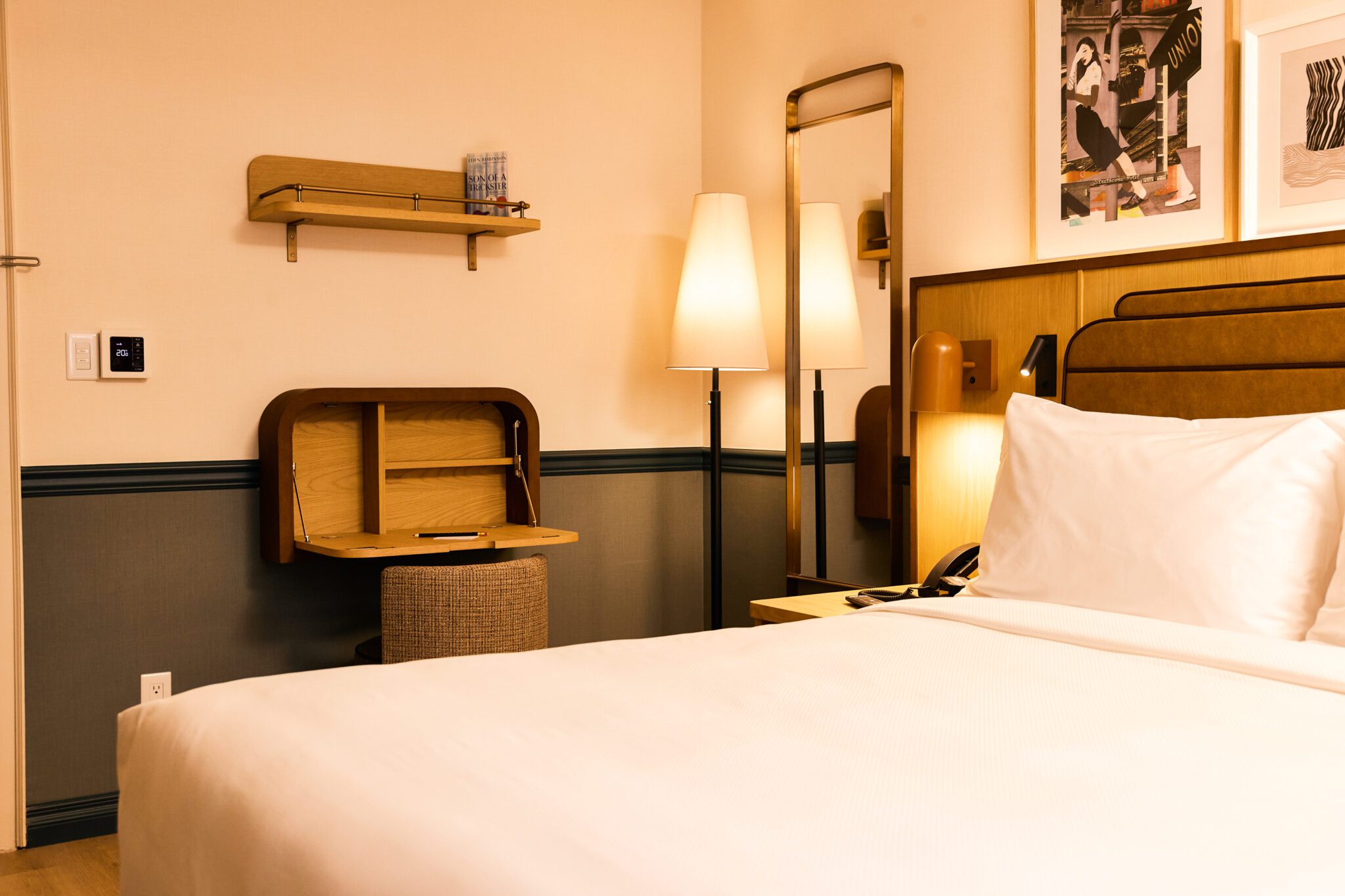 The hotel, which opened in February, is all about art, aesthetic and sustainability. The lobby is large, extended and feels like a cozy lounge more so than a bustling hotel lobby. The lobby features several different seating areas and work spaces, as well as private cubicles to take calls. Along the side of the lobby is the Humble Donkey restaurant. The name derives from a mural uncovered in the basement during renovations of a Spanish man riding a donkey. The team behind Union Hotel added the word ‘humble’ as reminder that they are boutique and independent. There are plans to develop the basement and space with the mural in the future.