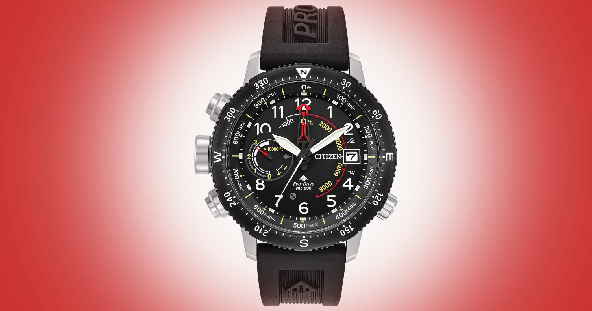 Topping the case is an anti-reflective, impact and shatter resistant mineral crystal. Not much else to report on the crystal. It’s very clear. Well done. Outside of the crystal is an exterior bi-directional rotating bezel purpose-built for the Altichron. Rounding the bezel are four compass points of direction, pipped by an N for north. In between the directional markers are dashes and numbers that break the bezel into 360 degrees of longitude. An interior bezel shows 1000 feet of scale for the altimeter function and angles down to the dial. The dial is a tad busy, as a watch with such function employs. I’ve seen busier on plain ol’ watches so no points deducted here. The top layer of the dial shows standard easy to read numbers. There’s a cutout for the date window at 3 o’clock. A small dial cuts into the 9 o’clock position. This dial’s main function shows altitude in the tens of thousands of feet but in its passive state shows the power reserve. It also has a function for calibration displayed with plus and minus symbols. Inside the numbers is the scale for thousands of feet spanning from minus 1000 to 8,000 feet. Marked at the bottom of the dial is WR200, denoting the watch’s water resistance down to 2oo metres and the wordmark for Eco-Drive.